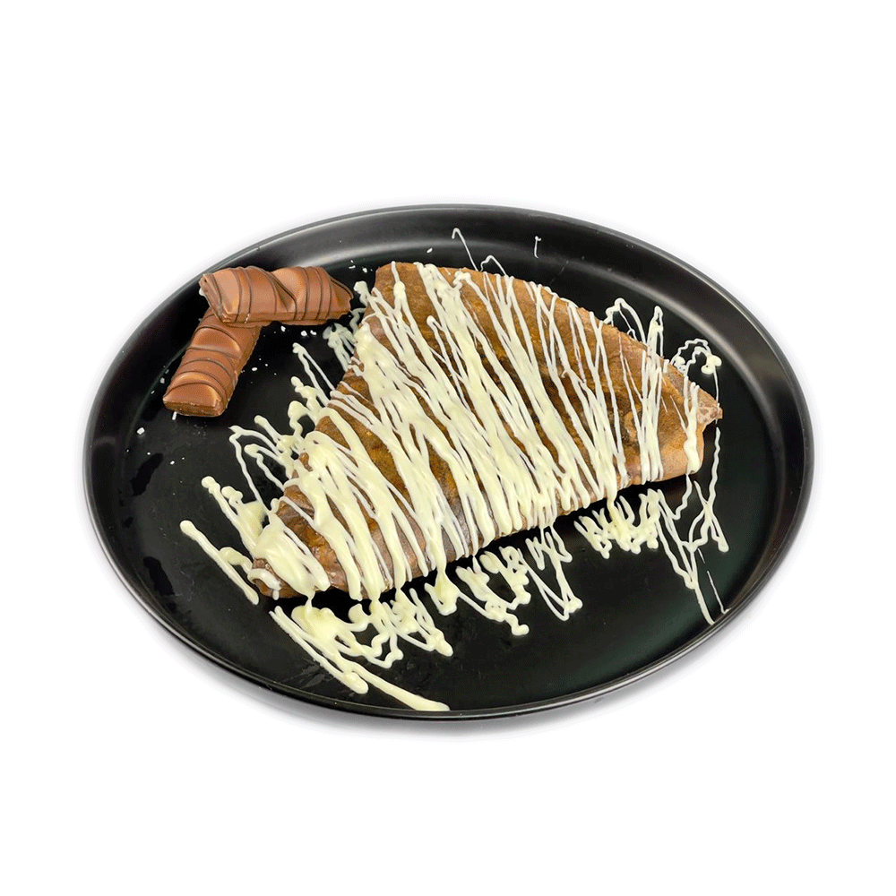 Ingrediente: aluat de clatite 150g, 43g kinder bueno, 40g Nutella, 20g topping de ciocolata alba.