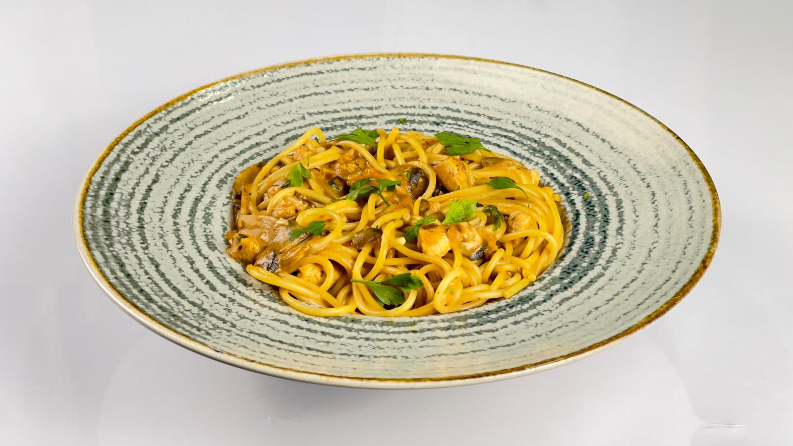 Spaghetele sunt gătite al dente, pentru a păstra textura perfectă și a absorbi sosul cremos. Pieptul de pui este fraged și suculent, tăiat în bucăți potrivite, astfel încât fiecare îmbucătură să fie bine echilibrată. Carnea completează perfect sosul bogat și aromat.