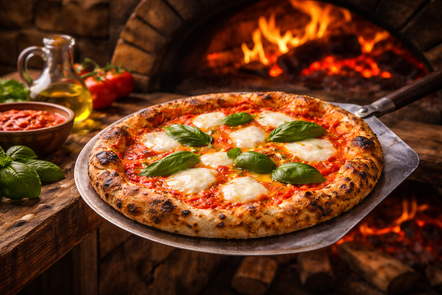 Pizza Margherita se coace tradițional într-un cuptor pe lemne la temperaturi foarte ridicate.